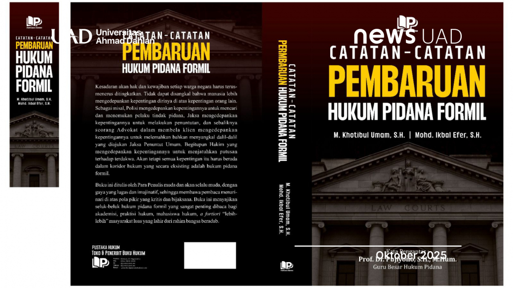 Dua alumni Fakultas Hukum (FH) Universitas Ahmad Dahlan (UAD), Muhammad Khotibul Umam dan Mohd. Ikbal Efer, menciptakan karya tulis dalam bentuk buku berjudul “Catatan-Catatan Pembaruan Hukum Pidana Formil” yang diterbitkan oleh Pustaka Hukum pada Kamis, 16 Oktober 2025.