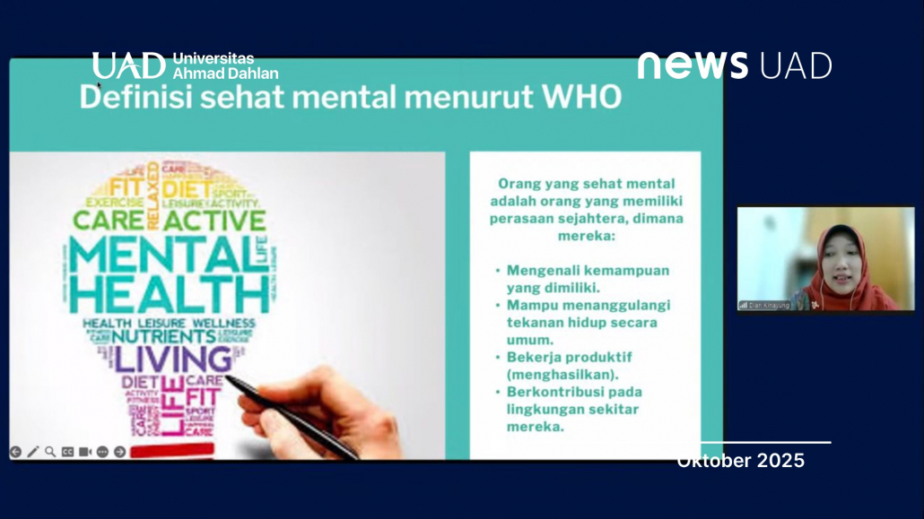 Universitas Ahmad Dahlan (UAD) melalui Biro Kemahasiswaan dan Alumni (BIMAWA) menyelenggarakan Seminar Online bertajuk “Kesehatan Mental untuk Semua: Dari Kesadaran Menuju Aksi”. Acara ini digelar dalam rangka memperingati World Mental Health Day 2025 pada Jumat, 10 Oktober 2025, dan disiarkan secara langsung di YouTube BIMAWA UAD.