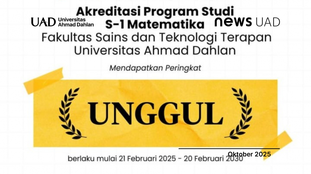 Universitas Ahmad Dahlan (UAD) kembali menorehkan prestasi membanggakan melalui capaian salah satu program studinya. Program Studi S-1 Matematika, Fakultas Sains dan Teknologi Terapan (FAST) UAD resmi meraih peringkat Akreditasi Unggul dari Lembaga Akreditasi Mandiri Sains Alam dan Ilmu Formal (LAMSAMA). Berdasarkan Keputusan LAMSAMA Nomor 014/SK/LAMSAMA/Akred/S/II/2025, akreditasi ini berlaku mulai 21 Februari 2025 hingga 20 Februari 2030.