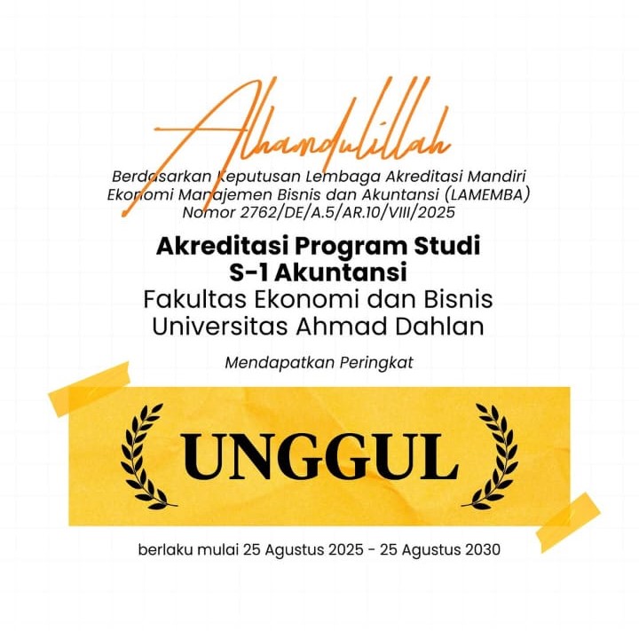 Universitas Ahmad Dahlan (UAD) kembali memperlihatkan konsistensinya dalam menjaga kualitas pendidikan tinggi. Salah satu bukti nyata hadir dari Program Studi S-1 Akuntansi di bawah naungan Fakultas Ekonomi dan Bisnis (FEB) yang berhasil meraih peringkat akreditasi Unggul dari Lembaga Akreditasi Mandiri Ekonomi Manajemen Bisnis dan Akuntansi (LAMEMBA). Berdasarkan keputusan Nomor 2762/DE/A.5/AR.10/VIII/2025, status akreditasi ini berlaku sejak 25 Agustus 2025 hingga 25 Agustus 2030.