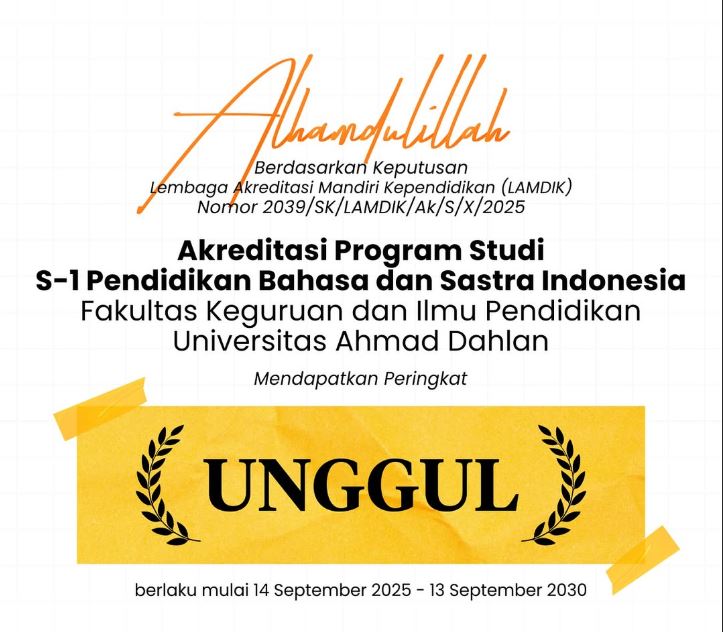 Universitas Ahmad Dahlan (UAD) kembali menorehkan prestasi membanggakan di bidang mutu pendidikan. Program Studi S-1 Pendidikan Bahasa dan Sastra Indonesia (PBSI), Fakultas Keguruan dan Ilmu Pendidikan (FKIP), berhasil meraih peringkat akreditasi Unggul dari Lembaga Akreditasi Mandiri Kependidikan (LAMDIK). Keputusan Ini tertuang dalam Keputusan Nomor 2039/SK/LAMDIK/Ak/S/X/2025 dan berlaku mulai 14 September 2025 hingga 13 September 2030.