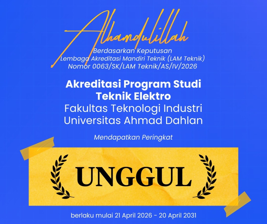 Universitas Ahmad Dahlan (UAD) kembali menorehkan capaian membanggakan dalam bidang penjaminan mutu pendidikan. Program Studi Teknik Elektro dari Fakultas Teknologi Industri (FTI) berhasil meraih peringkat akreditasi Unggul dari Lembaga Akreditasi Mandiri Teknik (LAM Teknik). Berdasarkan Keputusan Nomor 0063/SK/LAM Teknik/AS/IV/2026, akreditasi ini berlaku mulai 21 April 2026 hingga 20 April 2031.