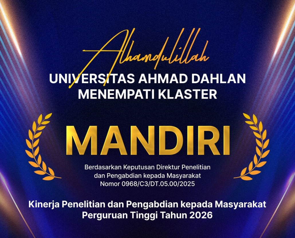 Universitas Ahmad Dahlan (UAD) kembali meraih prestasi nasional setelah berhasil mempertahankan posisinya di Klaster Mandiri, klaster tertinggi dalam penilaian kinerja penelitian dan pengabdian kepada masyarakat oleh Kementerian Pendidikan Tinggi, Sains, dan Teknologi (Kemendiktisaintek). Tahun ini, UAD menjadi satu dari 56 perguruan tinggi negeri dan swasta dari total 1.159 perguruan tinggi akademik se-Indonesia yang masuk dalam klaster tersebut. Capaian ini menandai empat tahun berturut-turut UAD berada pada posisi teratas.