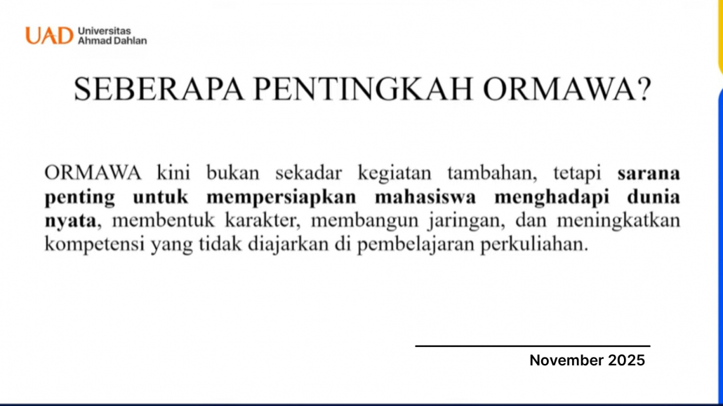 Biro Kemahasiswaan dan Alumni (Bimawa) Universitas Ahmad Dahlan (UAD) kembali menggelar Talkshow Softskill Series #2 Part 1 pada Jumat, 14 November 2025 secara daring melalui kanal YouTube Bimawa UAD. Mengangkat tema “Prestasi adalah Tradisi Kami: Bertumbuh Bersama Ormawa”, kegiatan ini menghadirkan tiga pemateri, yaitu Sher Naufal (Gubernur BEM Psikologi), Arif Setyawan (Gubernur BEM FKIP), dan Nuril Hilmi (Gubernur BEM Farmasi), serta dimoderatori oleh Nisrina Nurfi Aziza.